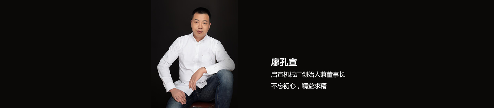 - 廖孔宣-瑞安市啟宣機(jī)械有限公司創(chuàng)始人兼董事長(zhǎng)。 1989年在溫州梧田撕裂膜廠做工,2005年自己創(chuàng)辦了鵬博機(jī)械廠,誠(chéng)信經(jīng)營(yíng),不忘初心,精益求精。之后機(jī)械廠正式改名瑞安市啟宣機(jī)械有限公司。